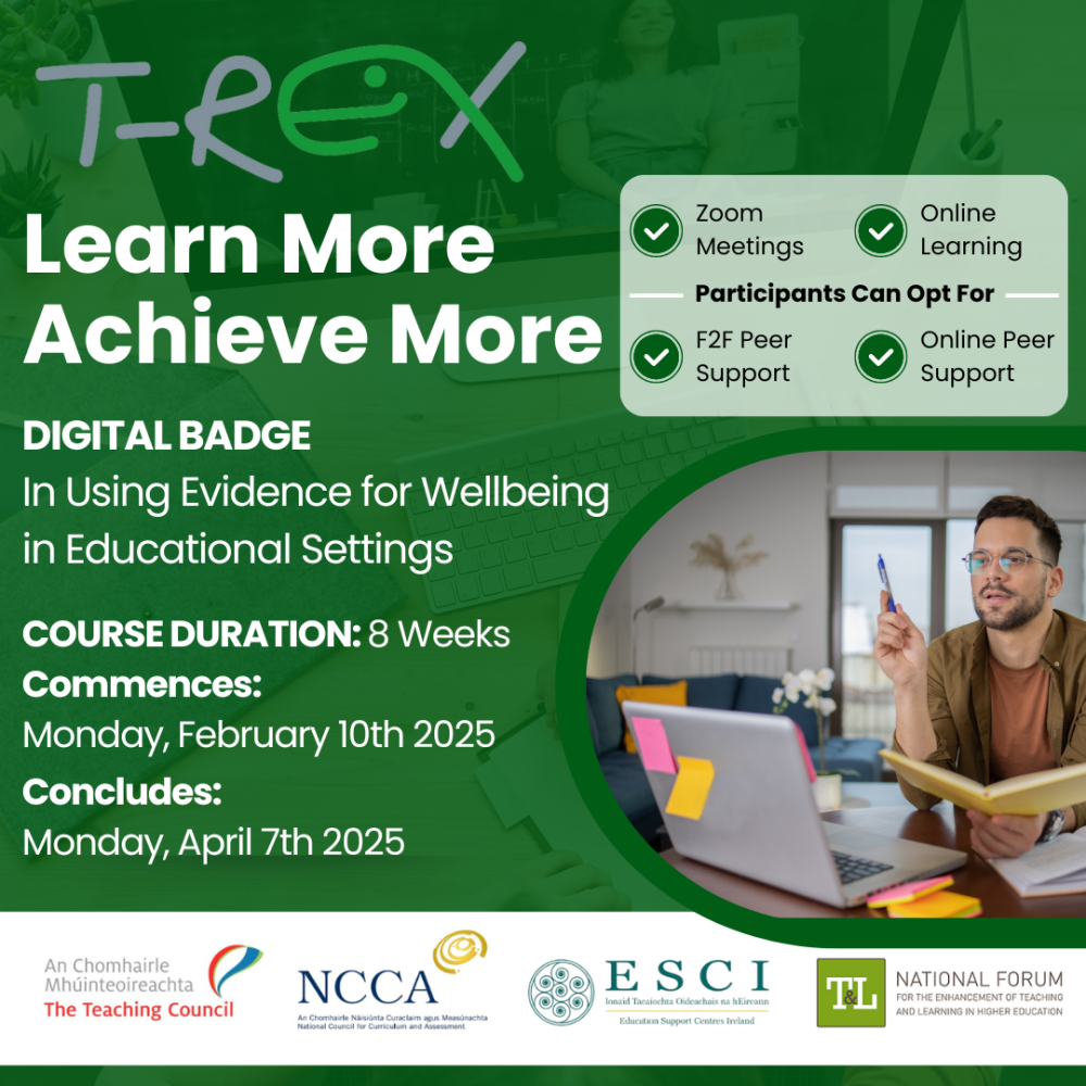 T-REX Digital Badge: Using Evidence for Educational Settings is an eight-week course, beginning on 10 February 2025, at 7:00pm via Zoom, in partnership with the education support centers of Ireland (ESCI). Two additional live sessions will take place in weeks five and eight. Course content will be available online, allowing participants to learn when it suits them best. Throughout the course, participants will collaborate in peer triads, choosing between online, face-to-