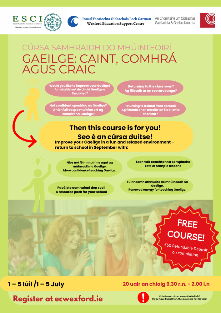 This is a face-to-face course in Wexford Education Support Centre from Tuesday, July 1st –Saturday, July 5th for teachers who would like to spend time with the Irish language to improve their own confidence and competence in a positive and enjoyable atmosphere.