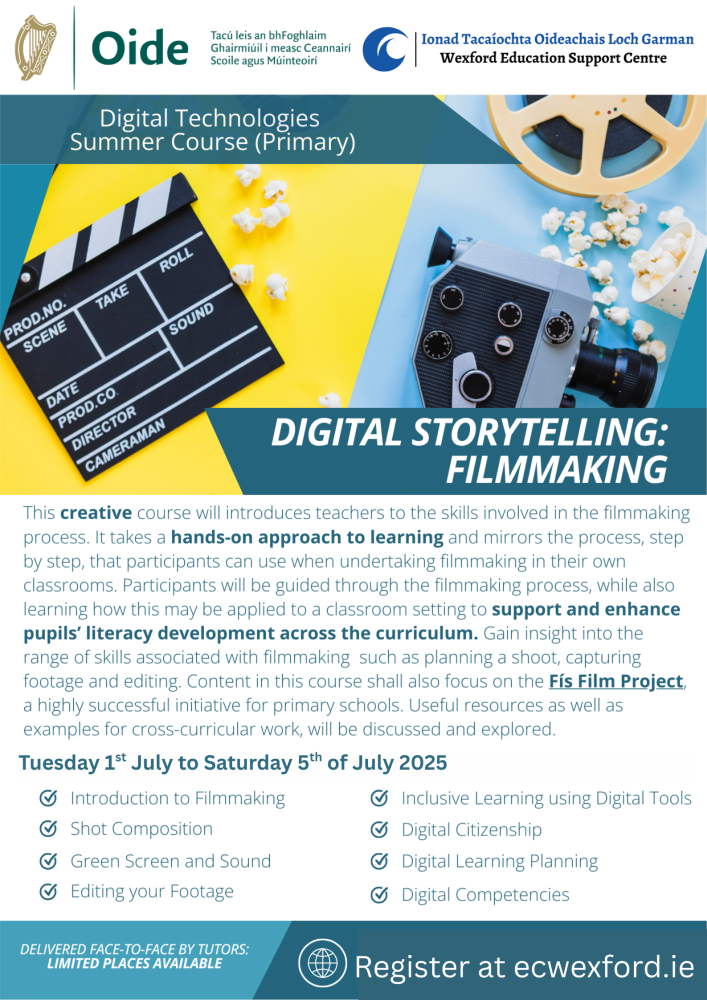 This creative PDST TiE summer course will introduce teachers to the skills involved in the filmmaking process in the primary school context. Each module in this course is designed to encompass a hands-on approach to learning and mirrors the process, step by step, that participants can use when undertaking filmmaking with their pupils.