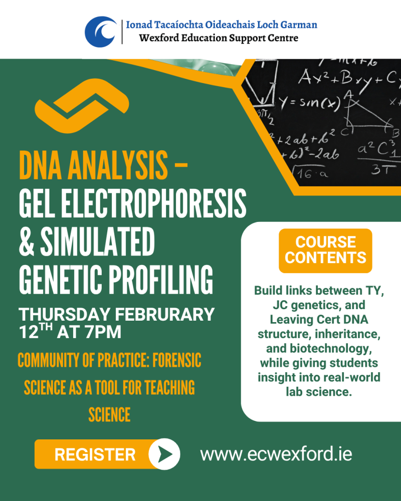 In this session, we will explore how to go beyond theory with accessible, engaging DNA analysis. In this session, you’ll learn how to teach gel electrophoresis and genetic fingerprinting using free online simulations and case studies. Build links between TY, JC genetics, and Leaving Cert DNA structure, inheritance, and biotechnology, while giving students insight into real-world lab science.
