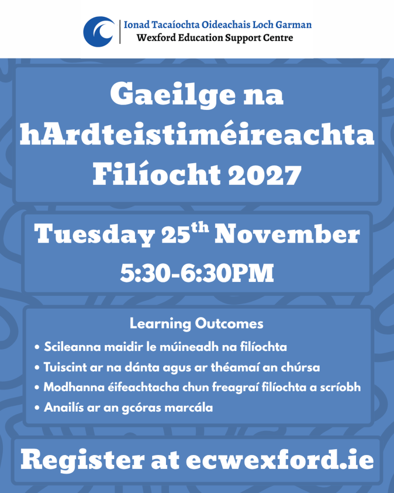 Tabharfar léargas ar fhilíocht na hArdteistiméireachta 2027. Déanfar na dánta a iniúchadh agus a chíoradh go mion. Roinnfear tascanna cruthaitheacha chun daltaí a spreagadh agus ceisteanna scrúduithe chun scileanna anailíse a fheabhsú sa rang.