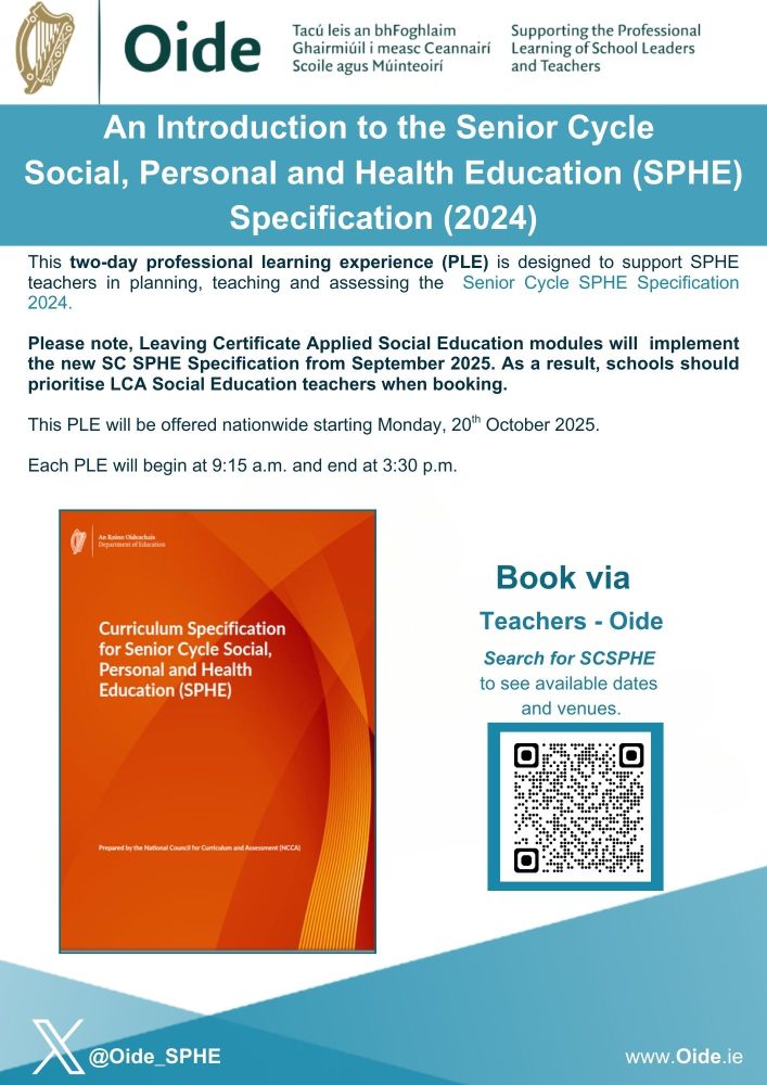 Limited to 26 places. This two-day professional learning experience is designed to support SPHE teachers in planning, teaching and assessing the SC SPHE Specification 2024. Substitution cover is available.